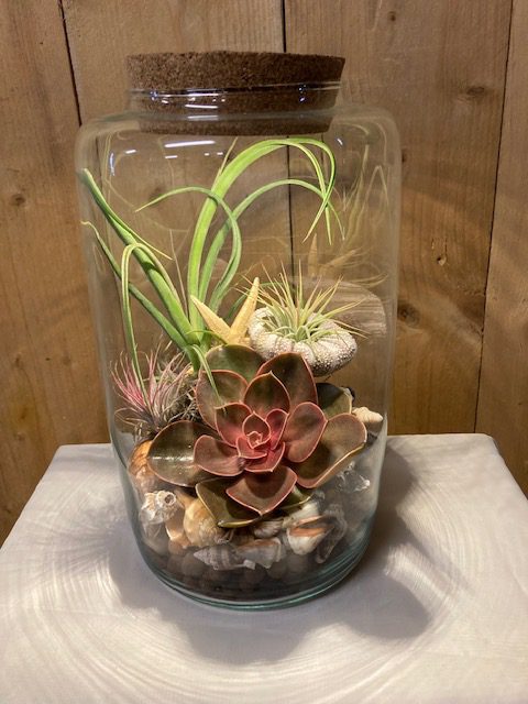 Bij deze workshop kan je een glazen pot met verlichting vullen met korrels, diverse planten en leuke bijproducten.