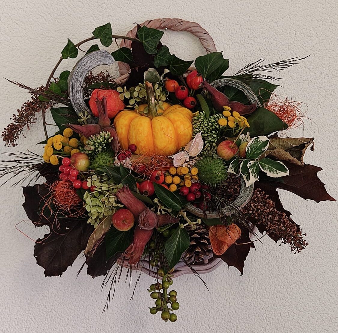 Een prachtige herfst decoratie bij jouw deur. Moet je toch zien, wat heeft de herfst prachtig kleuren. Ze komen allemaal samen in deze leuke mand.
