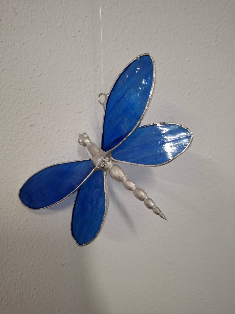 Jullie mogen nog de koperfolie om elk stukje glas plakken en daarna de stukjes aan elkaar vast solderen aan beiden kanten. Dit glaswerkje kun je meteen meenemen.