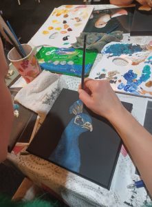 Bij de stand van Hilda Haselberg van Hilda’s art kun je een bijzondere workshop volgen! Op een zwart doek maak je een Pauw met Acrylverf