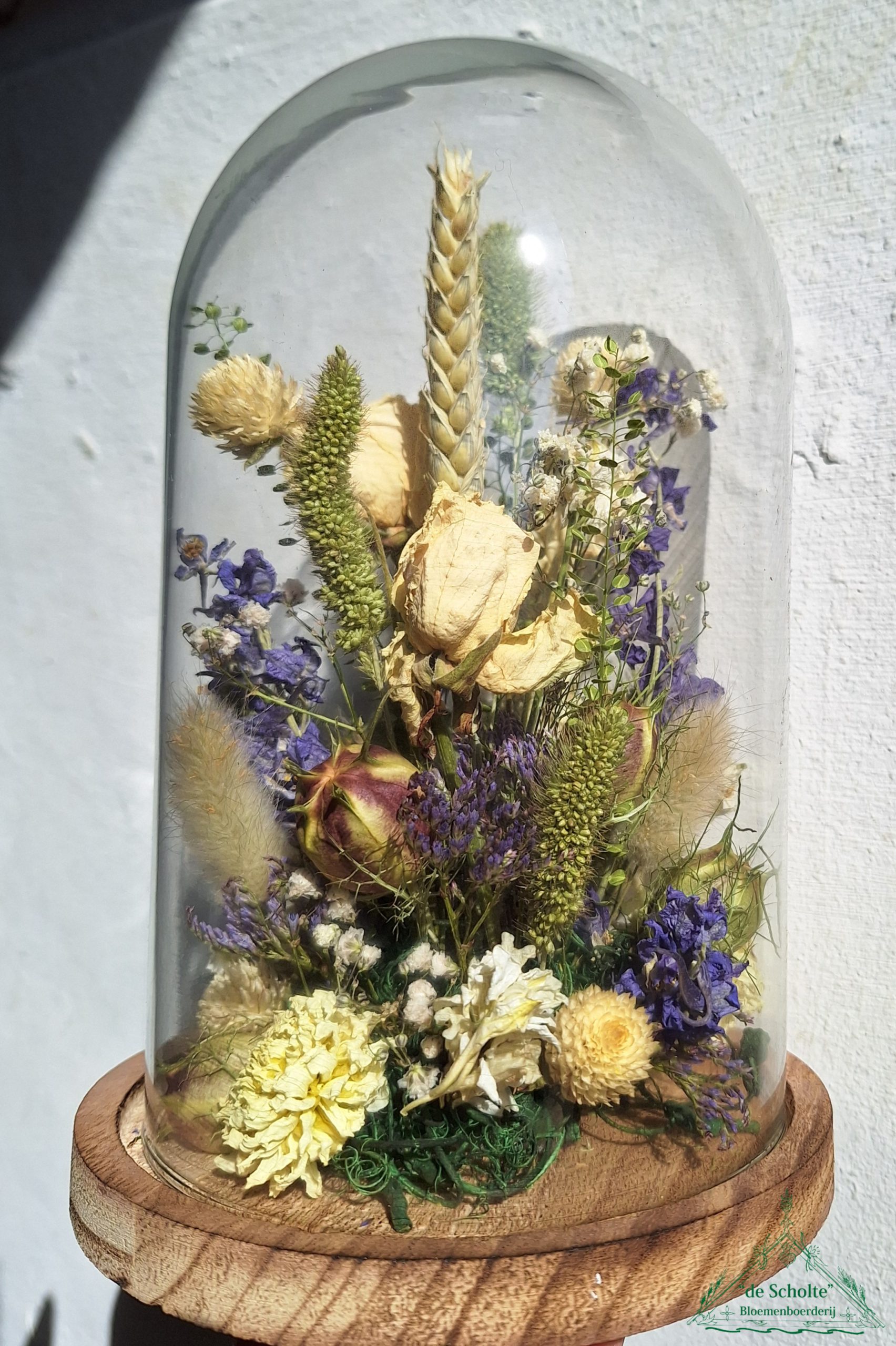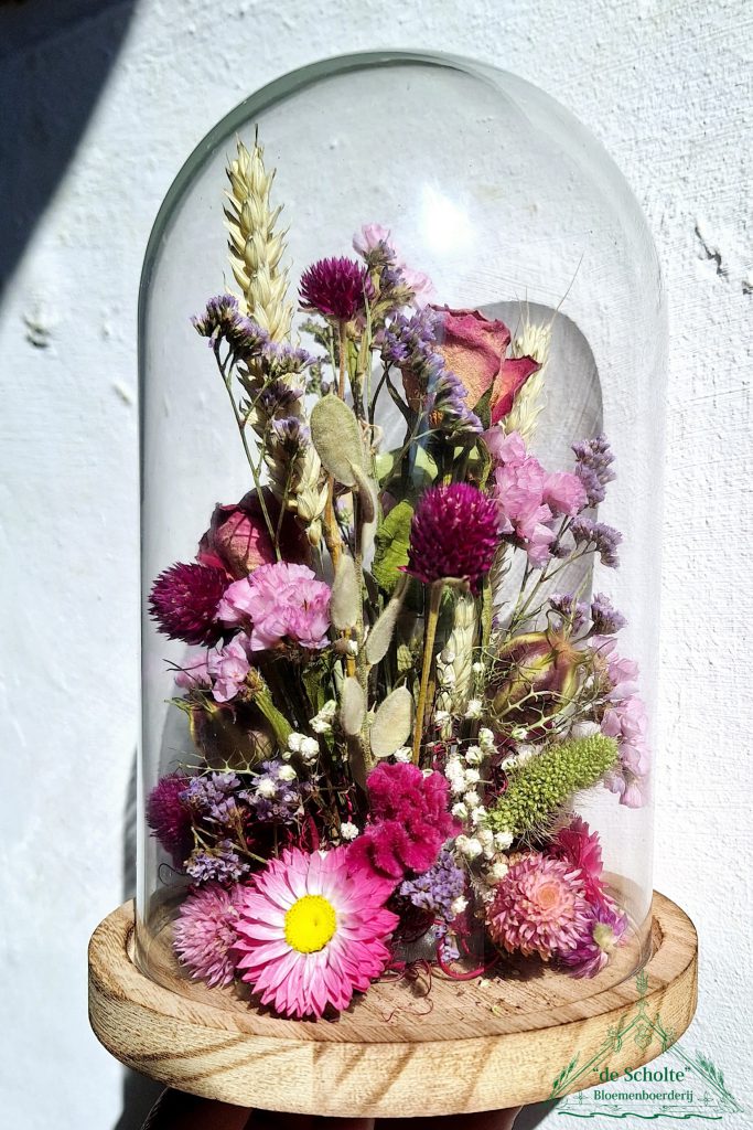 Maak tijdens de workshopmomenten op het Creaweekend een mooie stolp (14×21 cm) met droogbloemen.