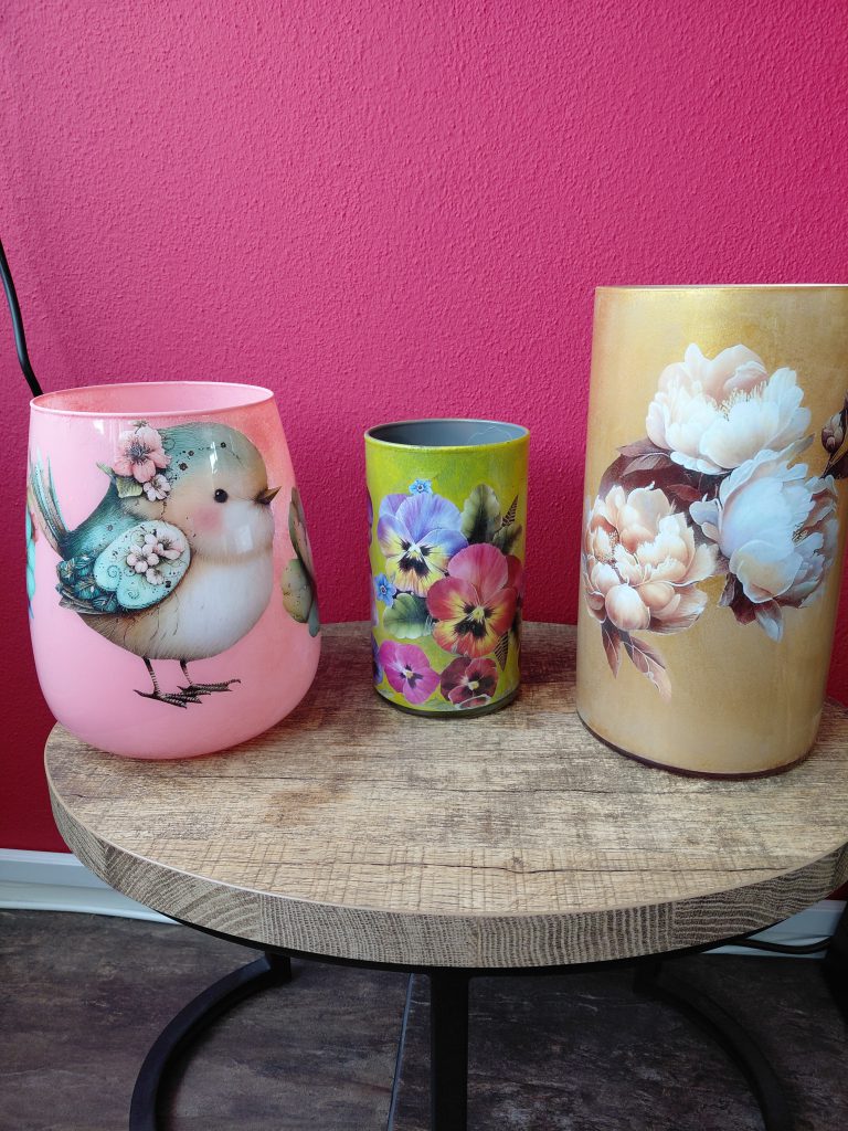 De Trend van 2026! Kom Bij Crea Christel een decoupage vaas maken met afbeeldingen. afgedrukt op speciaal papier en een keuze boekje kado met de meest gekozen afbeeldingen. Tevens te koop tijdens de Beurs.