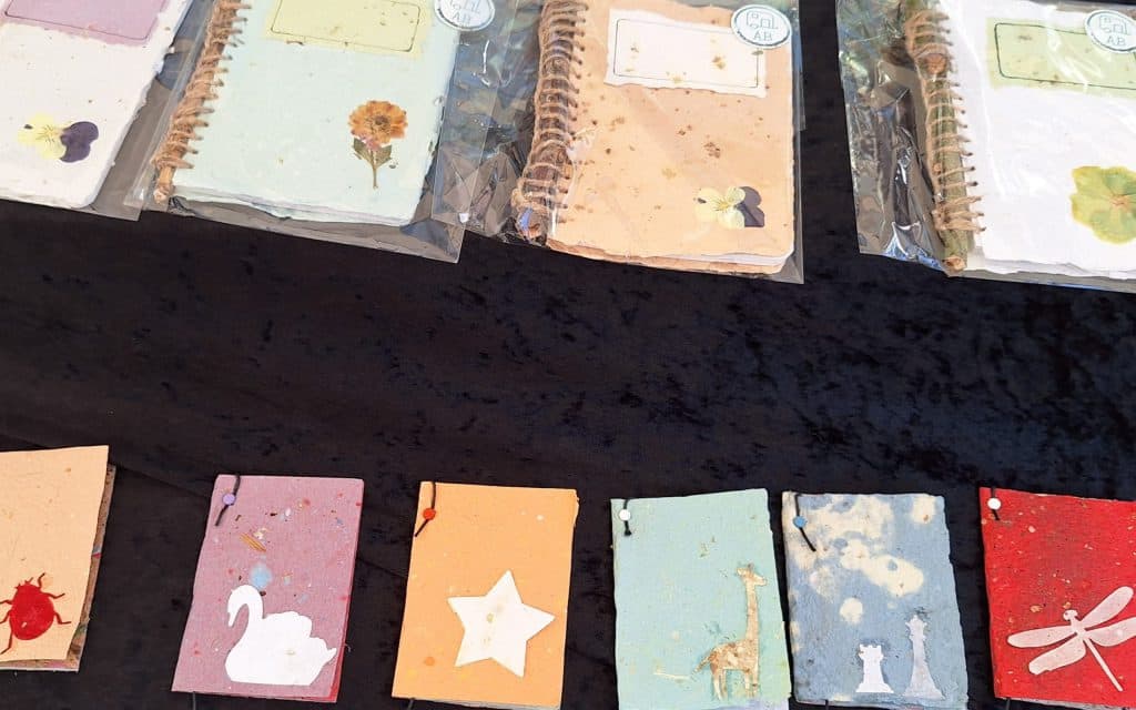 Maak van handgeschept papier een boekje in A6 formaat met 28 pagina's en een stevige kaft van verschillende kleuren en…