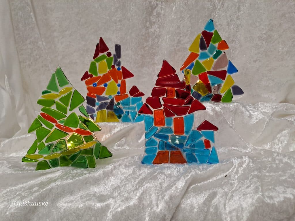 Leg, naar wens, gekleurde stukjes glas op een blank transparante ondergrond. Wij nemen het mee naar huis om in een…