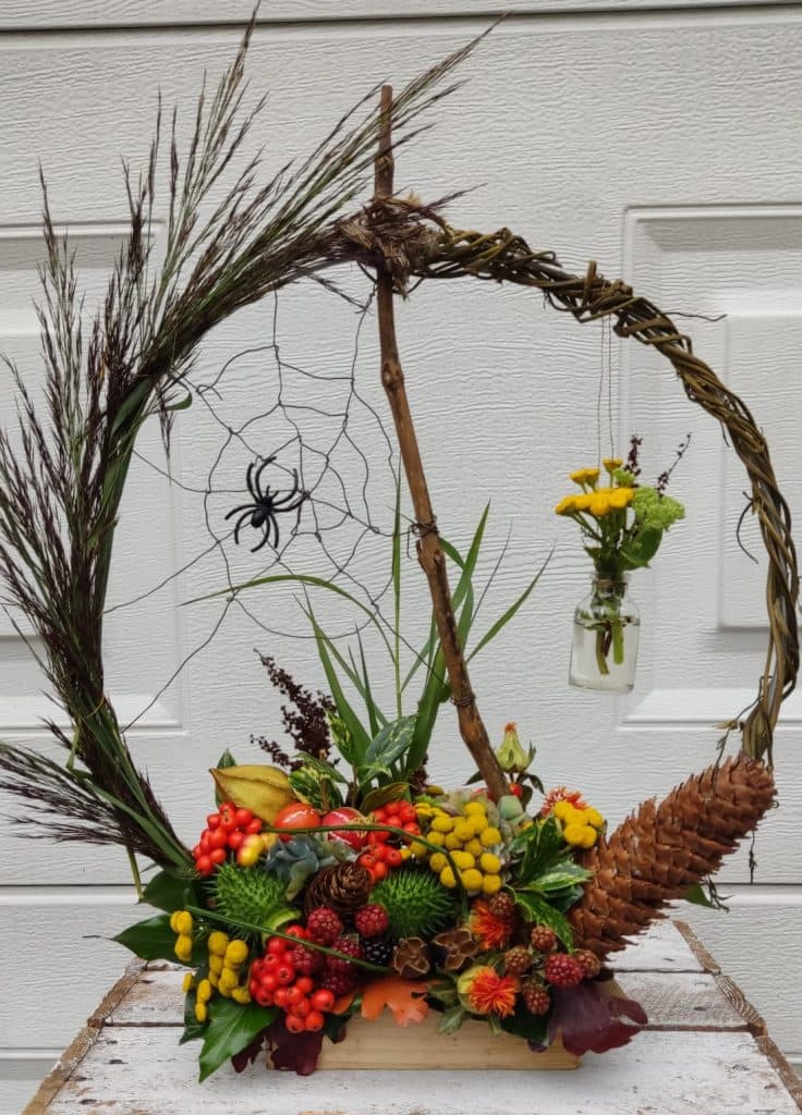 In een cirkel maakt u zelf een “echt” spinnenweb met daarin een spin en onderop komt een heel mooi herfststuk…
