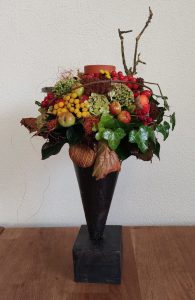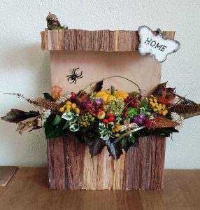 Dit schitterende herfststuk wordt gemaakt op een schaaltje, die in het houten frame komt te staan. De voorkant van het frame bekleden we met bananenblad,…